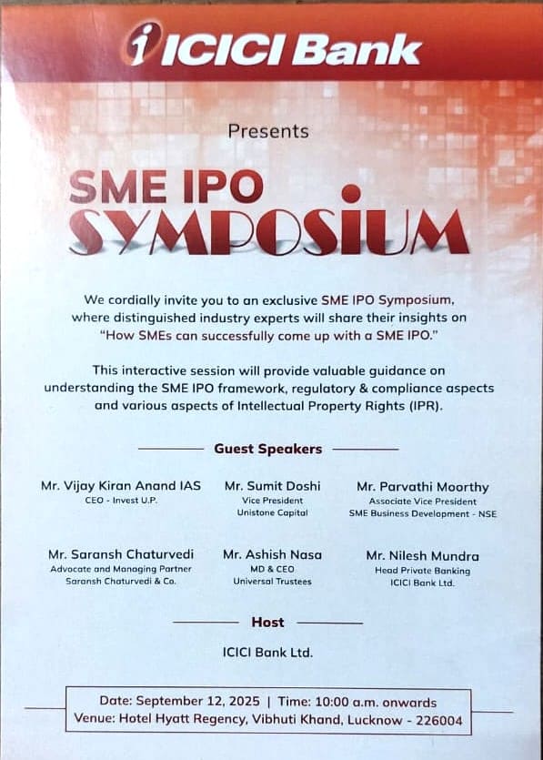 At a distinguished program organized by ICICI Bank, India’s largest bank, Saransh Chaturvedi was invited to deliver an in-depth address on Initial Public Offerings (IPOs) for SMEs and Startups. The session was designed to empower emerging enterprises with the knowledge and clarity required to navigate one of the most transformative milestones in their growth journey—transitioning from private ownership to becoming a publicly listed company.